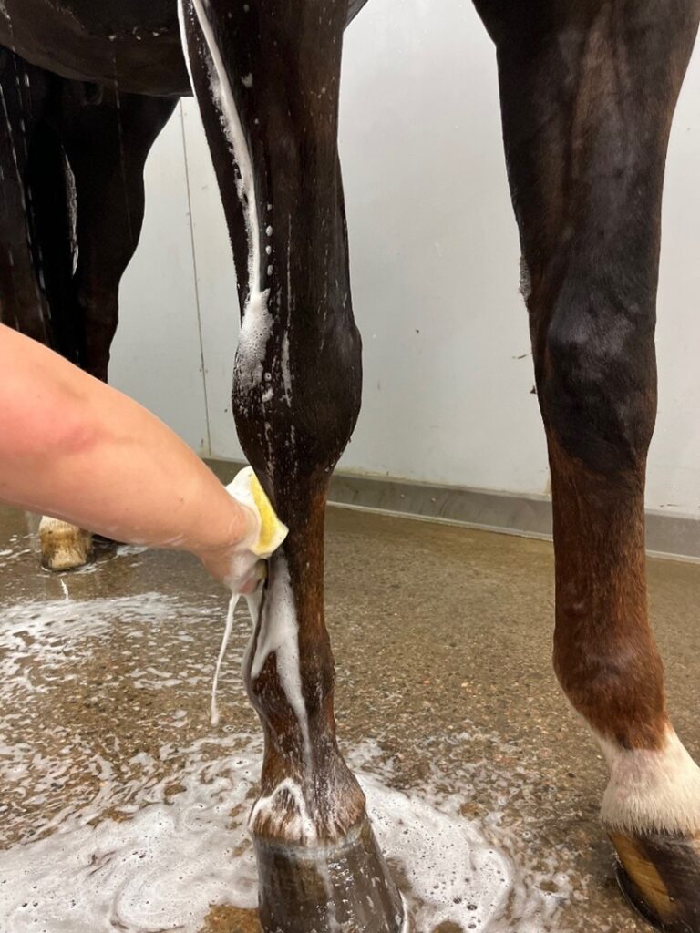 - Puhdista jalat säännöllisesti: Harjaa ja pese hevosen jalat aina, kun niissä näkyy mutaa tai likaa. Kuivaa jalat huolellisesti pesun jälkeen.