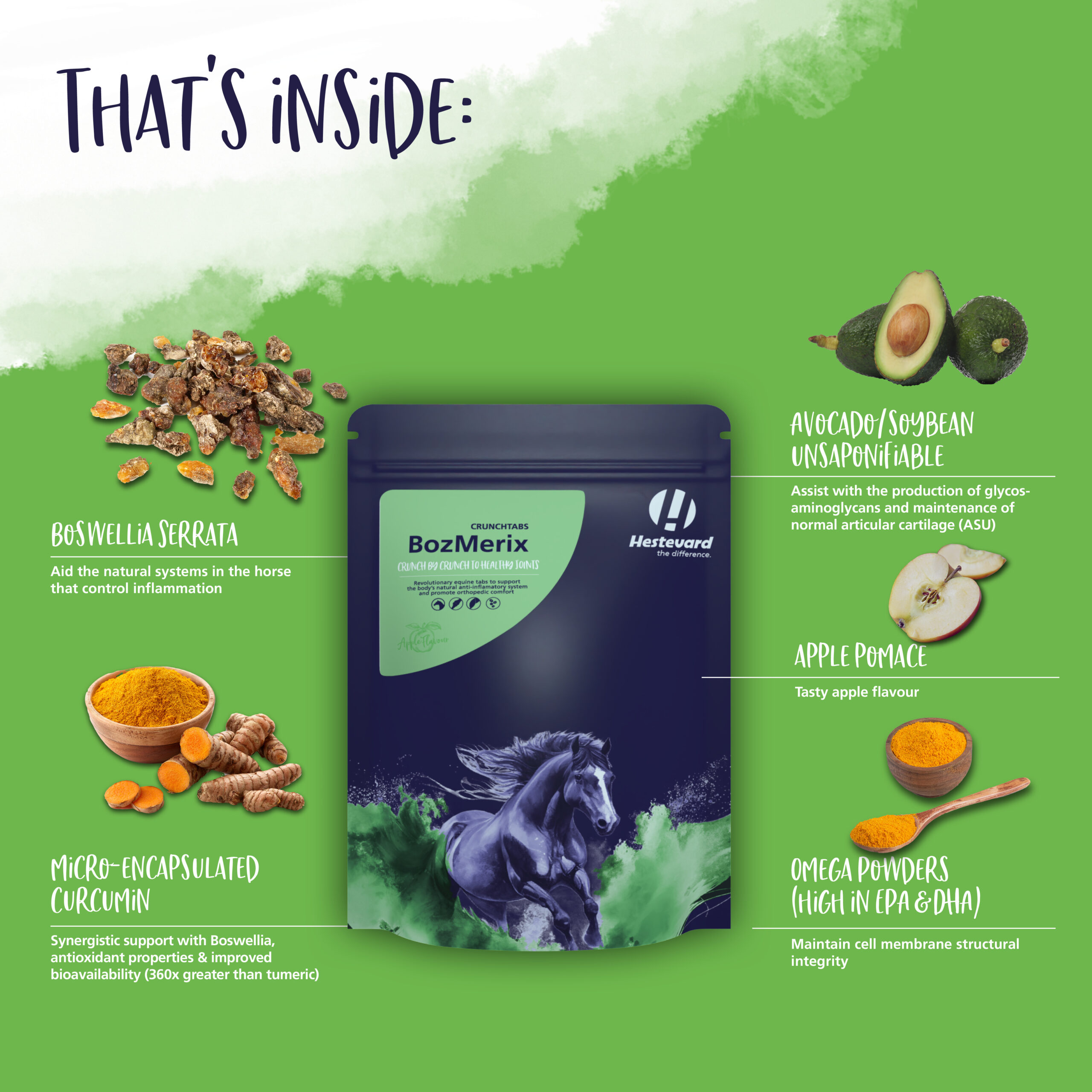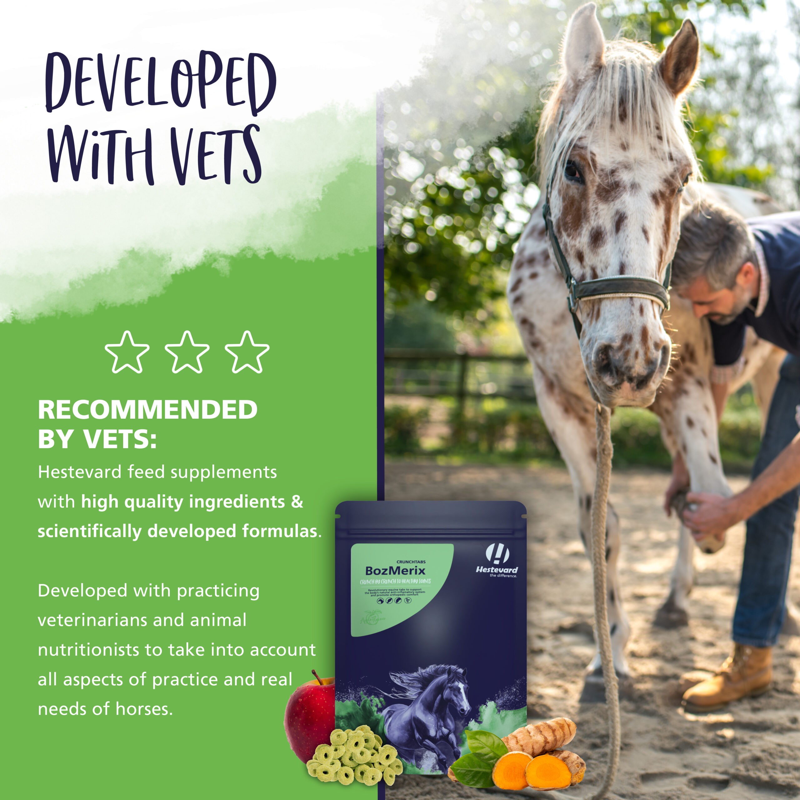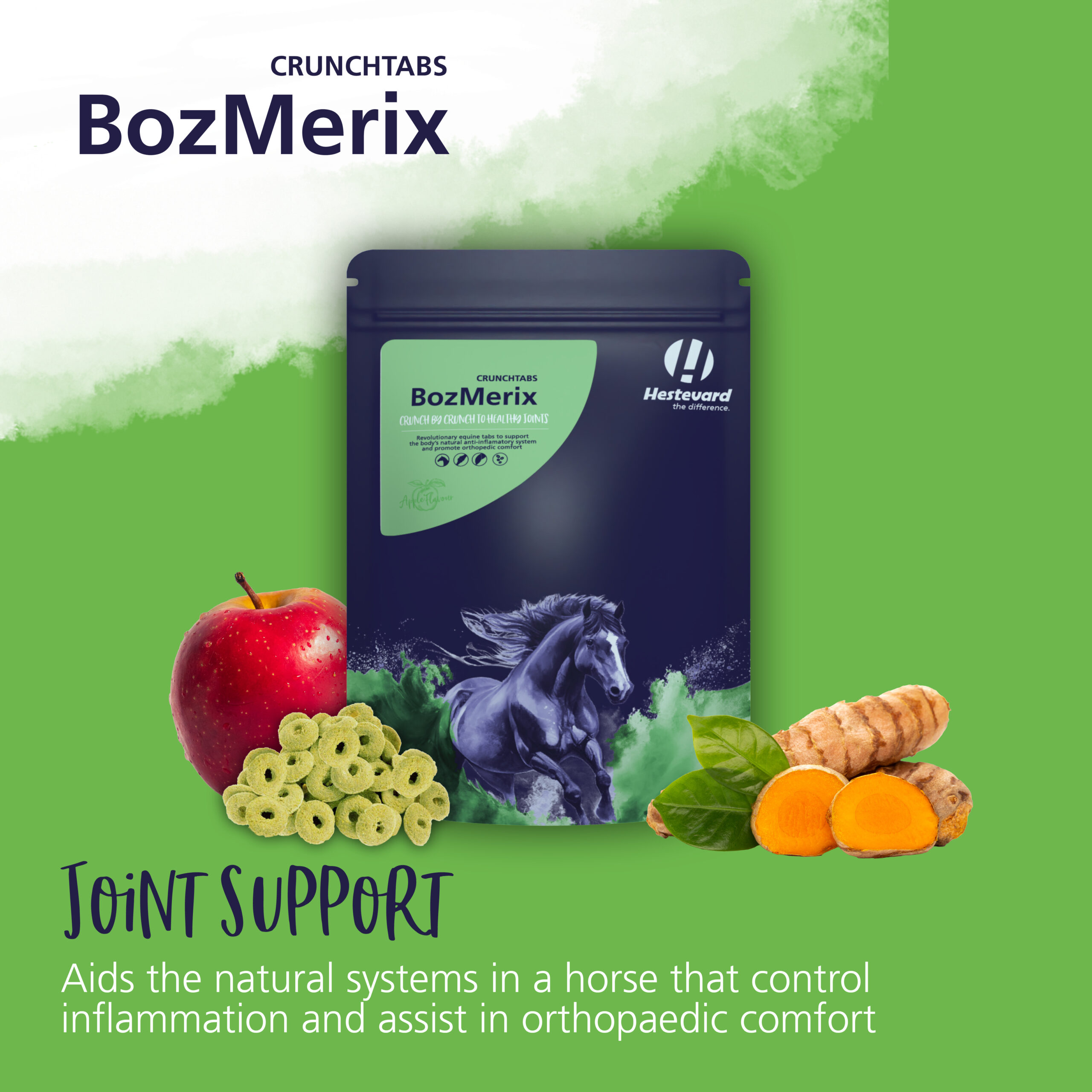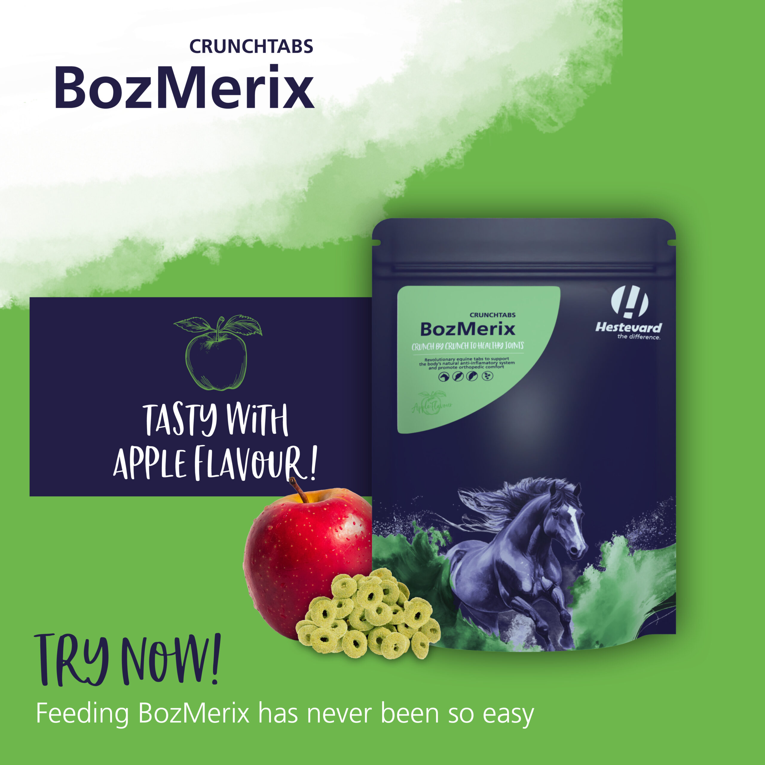 Hestevard BozMerix CrunchTabs täydennysrehu oli Spoga messujen 2025 talven yksi Top Innovation ehdokkaista! CrunchTabs tukee hevosen normaalia immuunijärjestelmää. Ainutlaatuiset ainesosat tukee hevosen luontaista liikkuvuutta, niveliä sekä lihaksistoa. Herkullinen omena maku!